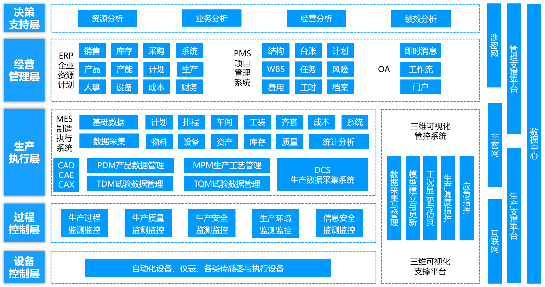 华宏智能工厂解决方案是华宏信达公司总结多年来军工信息化咨询、软件研发、工程服务经验,以工业4.0与中国制造2025建设要求作为建设目标,基于数字化、自动化、信息化、智能化的高度融合的建设思想,围绕产品工艺设计研究、生产执行、试验测试的产品生命周期全过程管理与管控的一体化解决方案。